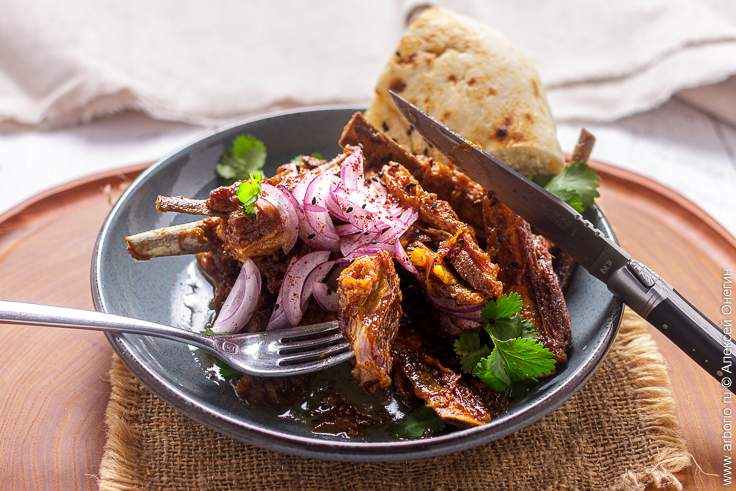 Откройте крышку сотейника, перемешайте бараньи рёбра с луком и готовьте ещё 10 минут под крышкой. Выложите тушёные бараньи рёбра на тарелку или блюдо, посыпьте тонко нарезанным луком, при желании украсьте сумахом и зеленью кинзы, и подавайте с лепёшками, которыми можно подобрать остатки вкуснейшего соуса.