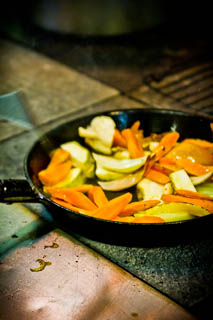 Налейте выпаренное вино в утятницу поверх мяса. Добавьте на сковороду немного растительного масла и начните обжаривать овощи на большом огне.
