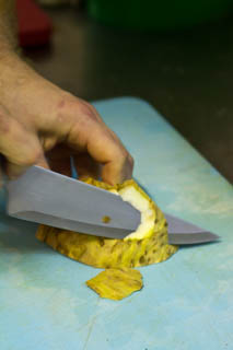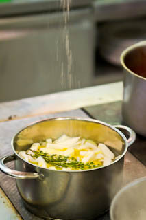 В ресторане говяжьи щеки подаются с пюре из сельдерея и картофеля — и пока мясо с овощами томится на плите, можно заняться его приготовлением. Для этого крупно нарежьте сельдерей (на сей раз — очищенный), картофель и лук, причем сельдерея должно быть даже немного больше, чем картошки, это придаст пюре не совсем обычный, узнаваемый вкус. Сложите все в кастрюлю, разровняйте, добавьте тимьян и залейте водой так, чтобы она только покрывала овощи.